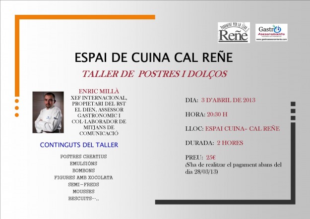 El passat dia 22 de maig de 2013 el xef de El Dien Enric Millà i el artesà de formatges de Tórrec Nicanor Coscolla van realitzar un taller de postres de dos hores a l’espai de cuina cal Reñe, els 20 assistents al taller van poder conèixer com es fa un formatge,…
